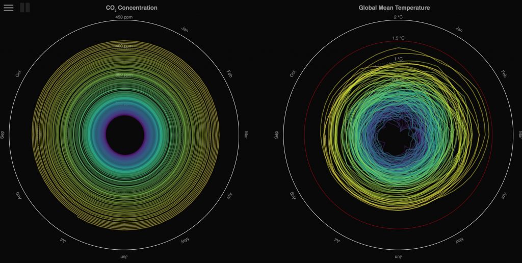Nella lettera, scritta prima che venissero rese pubbliche le affermazioni di Al Jaber, Mann e van Ypersele mostrano la stretta correlazione tra incremento della concentrazione di CO2 e aumento delle temperature globali [ndr, cliccando sull'immagine qui sotto è possibile osservare l’andamento delle spirali animate di CO2 e temperature che sintetizzano il comportamento del sistema climatico]