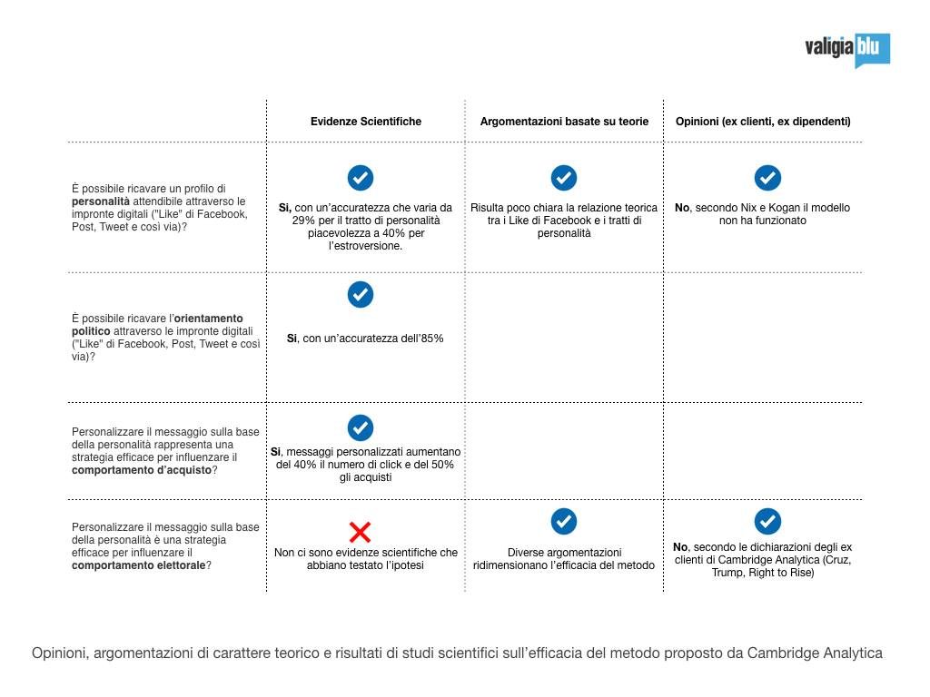 Opinioni. Sono state riportate diverse testimonianze, in particolare quelle basate sull’esperienza degli ex clienti di Cambridge Analytica. Sebbene le opinioni siano ampiamente prese in considerazione nelle scienze sociali, quando trattate in isolamento ci dicono poco sull’efficacia di un intervento. Ad esempio, nel caso delle opinioni di un cliente di un’agenzia di comunicazione politica, potrebbero interferire alcuni bias: aspettative irrealistiche, profezie auto-avveranti, scetticismo, mancata comprensione della metodologia e attribuzione di responsabilità all’esterno (se ho fallito, è stata colpa dell’agenzia). Per quanto riguarda opinioni e argomentazioni basate su teorie abbiamo usato come fonte l'articolo "The big data panic" pubblicato da Felix Salmon su Medium.