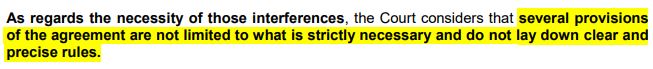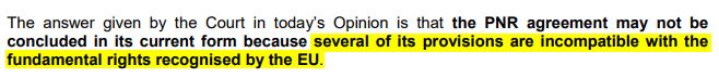 In conclusione, secondo la Corte la condivisione dei dati tra UE e Canada non rispetta i criteri di “necessità e proporzionalità” essenziali per una restrizione del diritto fondamentale dei cittadini alla tutela dei dati personali.