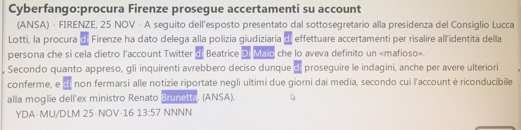 Il 25 novembre scorso, il giorno dopo l'intervista di Franco Bechis a Titti Ottaviani (sposata con Renato Brunetta) in cui affermava di essere lei "Beatrice di Maio", l'agenzia Ansa pubblica un lancio in cui si legge: