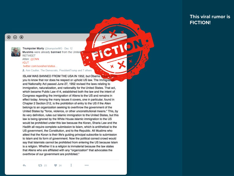 Sullo schermo di Isabel Catalan, una studentessa di 14 anni, c’è un tweet scritto da un utente dal nome TrumpsterMarty che dice: “I musulmani erano già banditi dagli Stati Uniti! Legge degli Usa 1952! Retweet!”. Sotto uno screenshot presumibilmente dell’Atto di Immigrazione e Nazionalità del 1952, che impedisce l’immigrazione di chiunque cerchi di rovesciare il governo “attraverso la forza, la violenza o altri mezzi illegali”. Questo, secondo quanto si legge nell’immagine del testo allegata sarebbe la prova dell’esclusione dell’immigrazione islamica negli Stati Uniti. «La persona che ha scritto questo tweet ha chiesto di essere retwittata, ma il tono del suo messaggio e il suo nome non mi tornano molto»», racconta Catalan. La studentessa segnala il messaggio come falso e Checkology le dà ragione.