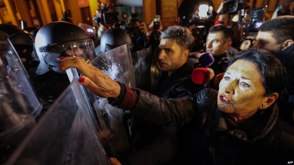 Le parole del capo di stato sono rimaste inascoltate e la polizia e i manifestanti si sono scontrati fino alle prime ore del mattino. In particolare, le forze dell’ordine hanno usato cannoni ad acqua, gas lacrimogeni, e secondo diverse testimonianze, pallottole di gomma per disperdere la folla che in alcuni momenti aveva provato a sfondare il cordone di poliziotti. Hanno anche arrestato diverse persone e ferito diversi giornalisti, con dei video che paiono dimostrare che alcuni di essi sono stati colpiti apposta dagli agenti. Tra i feriti anche Nana Malashkhia, la donna che era diventata il simbolo delle proteste del 2023 per un video in cui affrontava gli idranti della polizia imbracciando la bandiera europea.