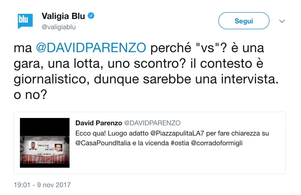ospitiamo anche #Casapound: https://t.co/OL9Ctt7cMX— Piazzapulita La7 (@PiazzapulitaLA7) November 9, 2017