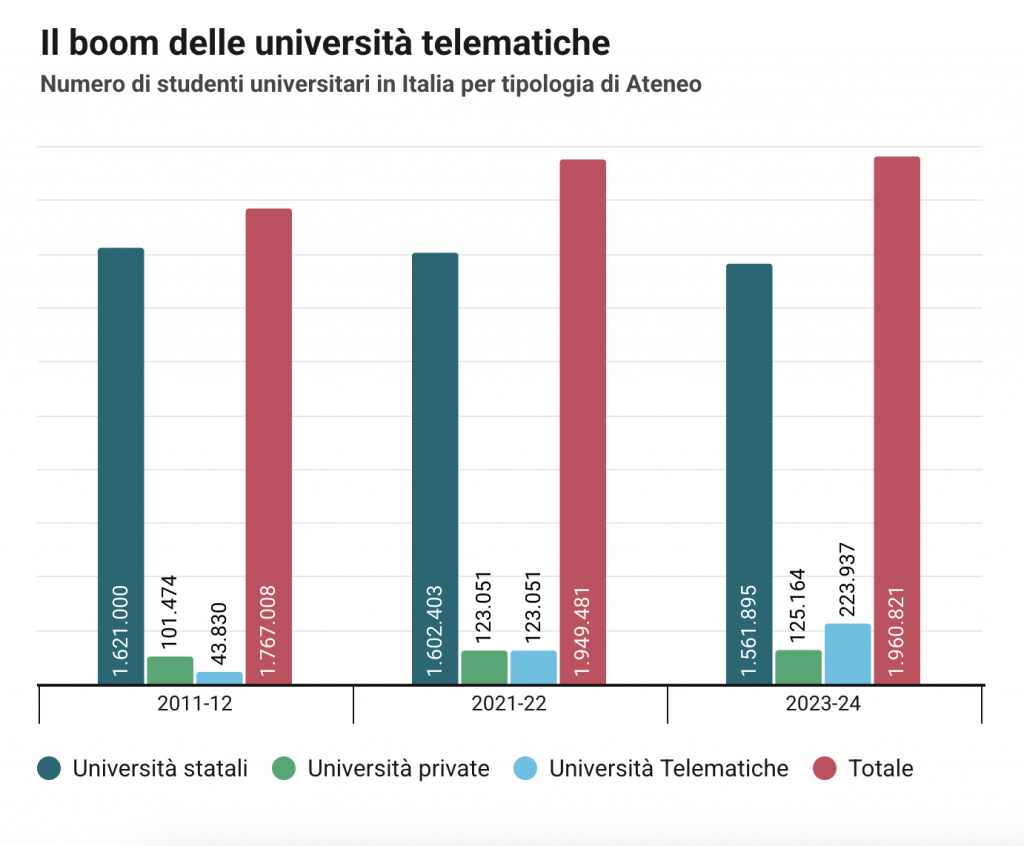 Si innescherebbe un processo potenzialmente pericoloso anche perché gli atenei meno prestigiosi vedono la concorrenza (sleale) e crescente delle università telematiche, in cui gli studenti sono clienti paganti (cui va quindi in qualche modo garantita la laurea), il personale è iper precario, il rapporto tra numero di studenti e docenti è di 384 a 1 e le lezioni sono soprattutto videoregistrate, eliminando così quell’interazione che è fondamentale per capire e crescere – a chi fa una domanda lo studente che non ha capito? Infine, come ha ricordato a Firenze l’accademica dei Lincei, Maria Luisa Meneghetti, gli esami sono spesso online e a risposte multiple. Ora, non che la selezione feroce sia cosa da esaltare, ma l’idea che medici o ingegneri si formino facendo esami guardando video e rispondendo a quiz online non è esattamente rassicurante.
