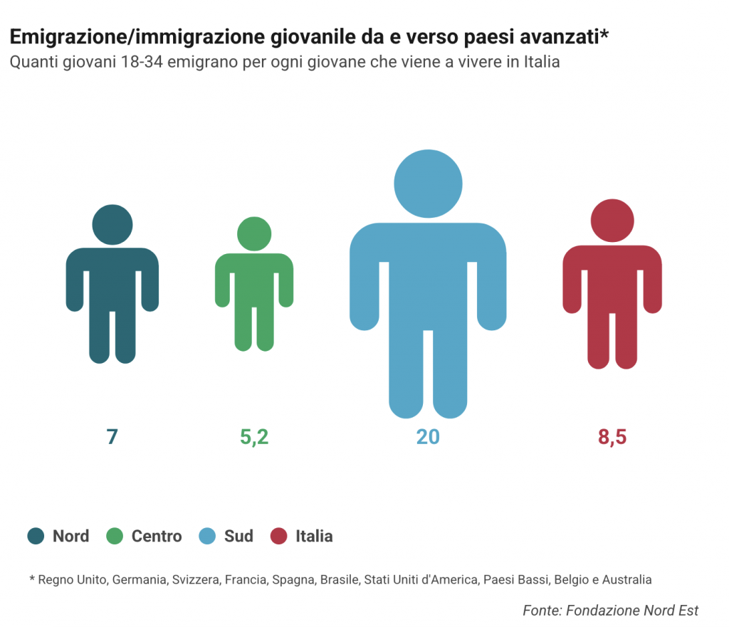 Secondo i dati di uno studio della Fondazione Nord Est, presentati da Luca Paolazzi, la novità è che tra le centinaia di migliaia di 18-34enni che lasciano l’Italia è in crescita il numero di coloro che emigrano dalle regioni più ricche: erano meno di un terzo prima del Covid, sono stati il 43% nel 2022. Molti non citano i salari più alti o la necessità come molla che li spinge a lasciare l’Italia ma le opportunità, la qualità del lavoro e della vita.