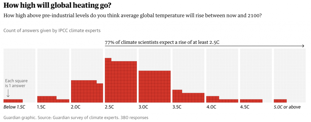 Qual è il futuro del pianeta? In che direzione sta andando il riscaldamento globale? C’è speranza per evitare il peggio? Siamo ancora in tempo per fermare l’aumento delle temperature? Sta facendo molto discutere un sondaggio del Guardian che ha chiesto a 380 scienziati climatici del Gruppo intergovernativo di esperti sul cambiamento climatico (IPCC) cosa prevedono per il futuro del nostro pianeta. Secondo la maggior parte degli esperti contattati, entro il 2100 le temperature globali saliranno di almeno 2,5°C rispetto ai livelli pre-industriali, quasi la metà un riscaldamento globale di 3°C, mentre appena il 6% ritiene che il limite di 1,5°C concordato con l’accordo di Parigi nel 2015.