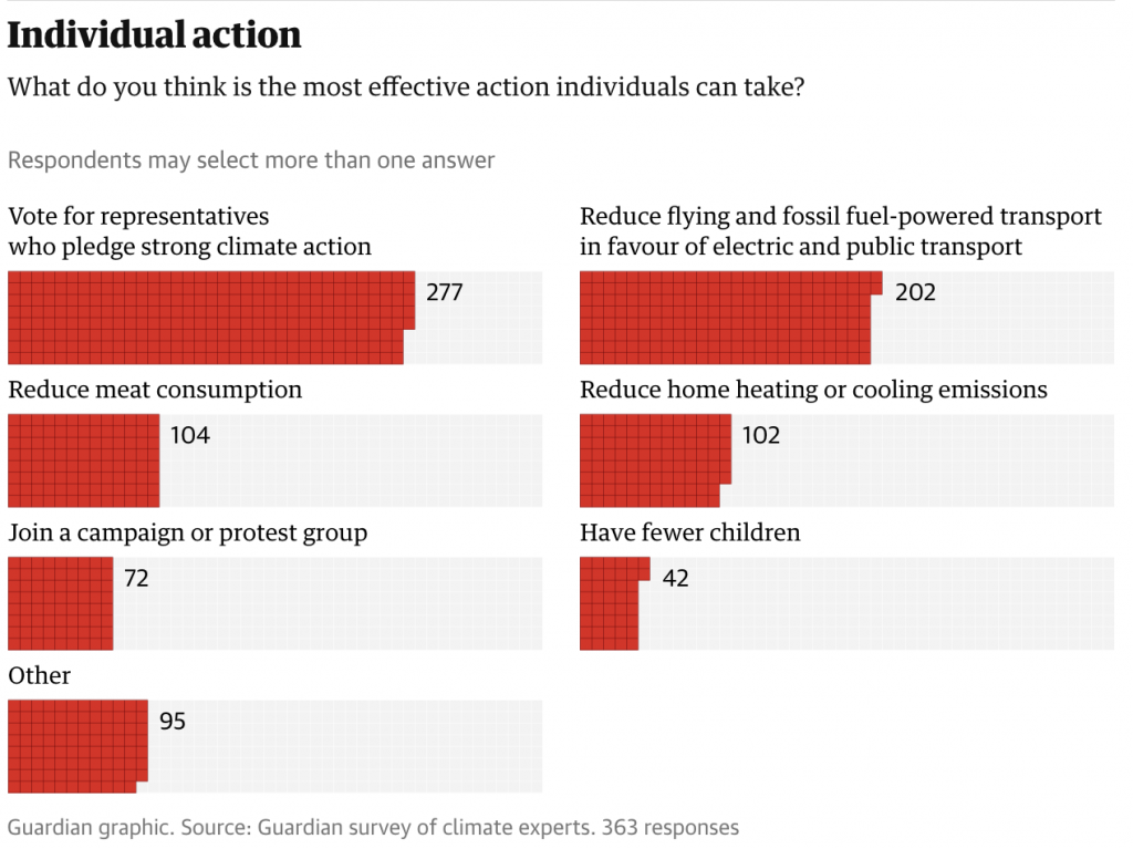 Tra le azioni individuali, quasi il 30% degli esperti ha dichiarato che mangiare meno carne è l'azione più efficace per il clima. Una percentuale leggermente minore ha invece sostenuto la riduzione delle emissioni derivanti dal riscaldamento o dal raffreddamento delle case, installando ad esempio pompe di calore.