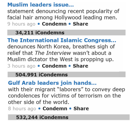 l’applicazione sarà molto utile anche per chi va alla ricerca di dimostrazioni di dissenso dagli atti terroristici: una volta effettuato l’accesso, il guest non-musulmano col tweet reazionario in bozza potrà controllare in presa diretta quanti musulmani hanno effettivamente denunciato il proprio orrore nei confronti di barbarie di varia natura, e così evitare di twittare a caso.