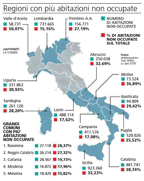 Secondo il rapporto di Legambiente "Ecosistema Urbano 2017", pubblicato lo scorso ottobre, il fenomeno delle case vuote ha proporzioni clamorose a Roma (dove ci sono oltre 120mila abitazioni non occupate), a Palermo (40mila case senza inquilini) e, in generale, nelle grandi città come Milano, Torino e Genova, dove ci sono in media tra i 30mila e i 40mila appartamenti deserti. Se si osservano i dati sulle case vuote in relazione al totale delle abitazioni presenti nei singoli Comuni la situazione in alcuni casi è sorprendente, come a Ravenna e Reggio Calabria, dove tra un quarto e un terzo delle abitazioni sono senza inquilini.