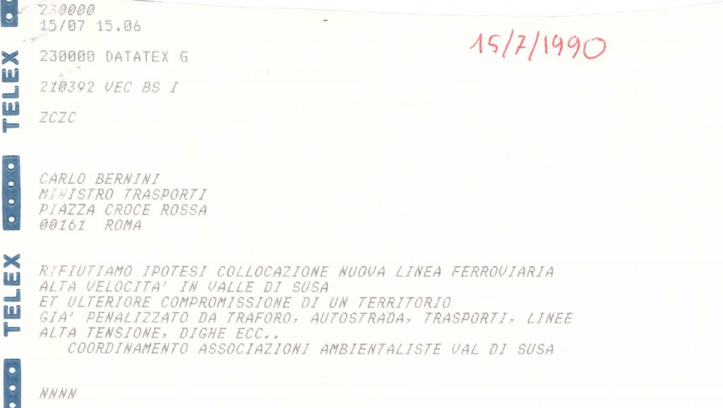 Nel luglio di quell’anno iniziano, però, anche le prime proteste in ambito locale. Dopo un incontro tra i presidenti del Comitato, l’allora ministro dei trasporti Carlo Bernini e i presidenti delle regioni Lombardia, Veneto e Friuli, il Coordinamento delle associazioni ambientaliste della Valle di Susa, impegnate in quel periodo su diverse questioni che riguardavano il territorio – dai lavori dell'autostrada del Frejus, alla realizzazione dell’elettrodotto – si schiera contro questa nuova opera, mandando un telegramma al ministro e alla Commissione e alla Commissione Lavori Pubblici della Camera: “Rifiutiamo ipotesi di collocazione di una nuova linea ferroviaria ad Alta Velocità in Val di Susa, e di una ulteriore compromissione di un territorio già penalizzato da traforo, autostrada, linee ad alta tensione, grandi impianti idroelettrici ecc …”.