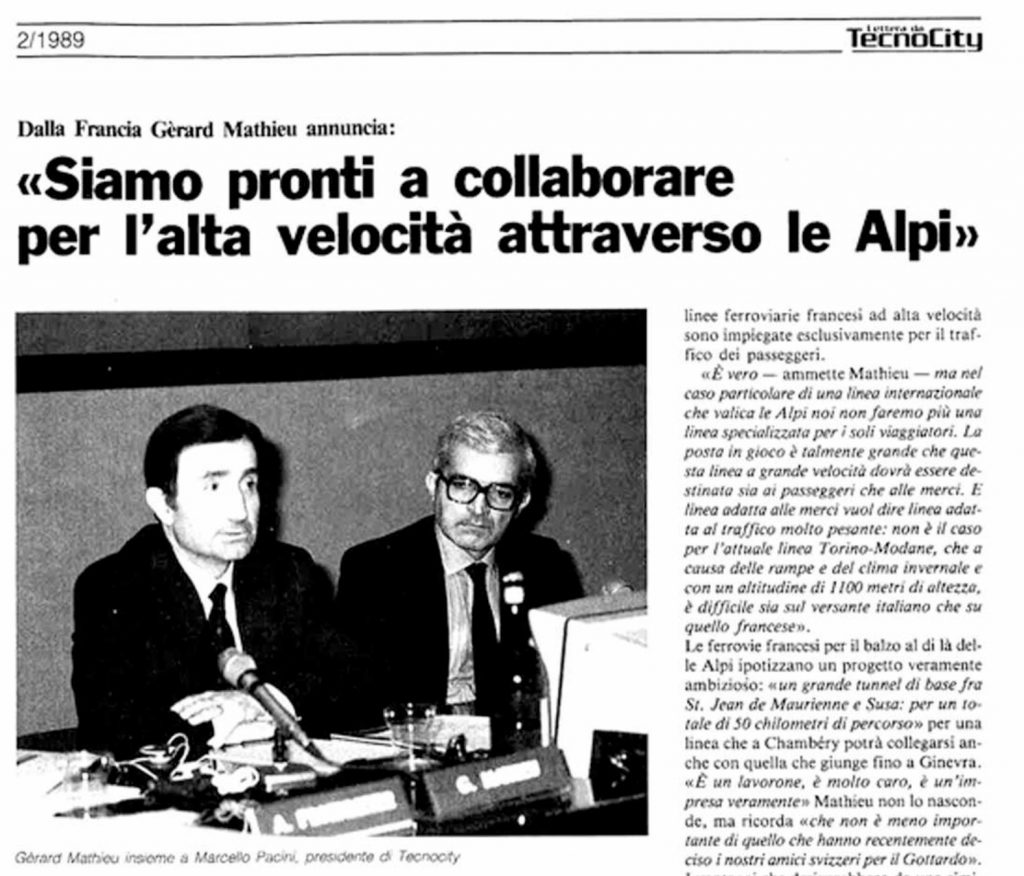 Sullo stesso numero della rivista viene presentato il progetto francese di una linea TGV (Train à Grande Vitesse, cioè treni ad alta velocità) tra Torino e Lione con una galleria lunga 50 chilometri che doveva attraversare le Alpi. L’allora responsabile del Dipartimento Alta Velocità della società pubblica Société Nationale des Chemins de fer Français (SNCF), Gerard Mathieu, affermava che «la Lione-Torino è probabilmente una delle tratte comunitarie più importanti, per non dire l'unica odierna tratta ferroviaria strettamente comunitaria. C’è un gran progetto, che è stato varato, c’è una vera motivazione europea alla base di questo progetto, una posta in gioco che dovrebbe mobilitare sia Francia che Italia, ma forse anche la Comunità». Mathieu sottolineava inoltre che «la posta in gioco è talmente grande che questa linea a grande velocità dovrà essere destinata sia ai passeggeri che alle merci. E linea adatta alle merci vuol dire linea adatta al traffico molto pesante (...)».