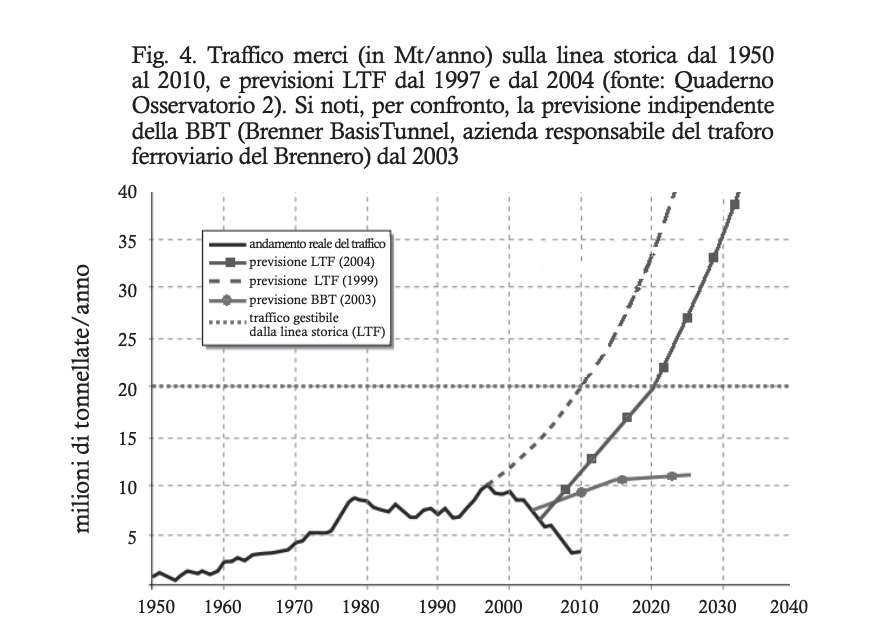 Nel 2011 il “Quaderno 8” dell’Osservatorio sulla Tav, all’epoca guidato da Mario Virano, ha mostrato che le stime fatte agli inizi del 2000 erano state troppo ottimistiche, prospettando un incremento delle tonnellate di merci trasportate su due orizzonti temporali (58,4 milioni nel 2035 e 97,3 milioni nel 2053), che nel caso in cui si fosse verificato, osservava un documento critico dell’opera, avrebbero portato anche paradossalmente a un aumento del trasporto di merci su strada e, conseguentemente, alla triplicazione dei tratti autostradali nella Val Susa. Invece, stando ai dati sul traffico ferroviario, tra il 2007 e il 2010 si stava registrando un calo del traffico ferroviario lungo la tratta storica.