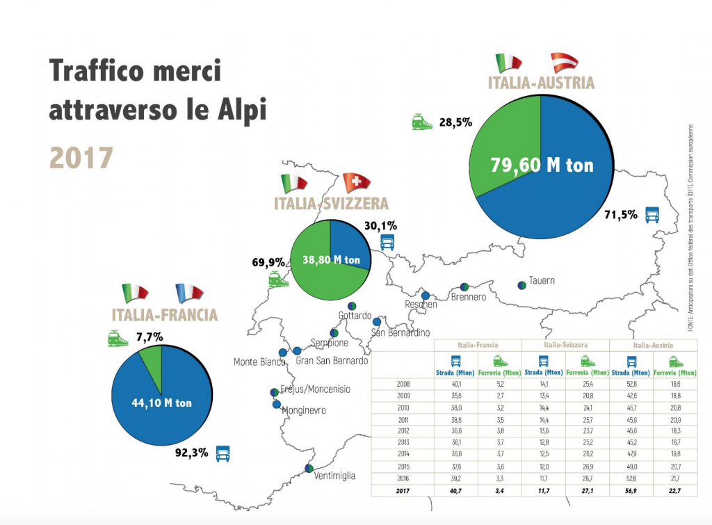 Secondo i dati diffusi lo scorso novembre dall’Osservatorio sulla Tav, al confine tra Italia e Francia sono transitati 44,1 milioni di tonnellate di merci. Nello stesso periodo sono passate circa 38,8 milioni di tonnellate di merci tra Italia e Svizzera e 79,6 milioni di tonnellate tra Italia e Austria attraverso il Brennero.