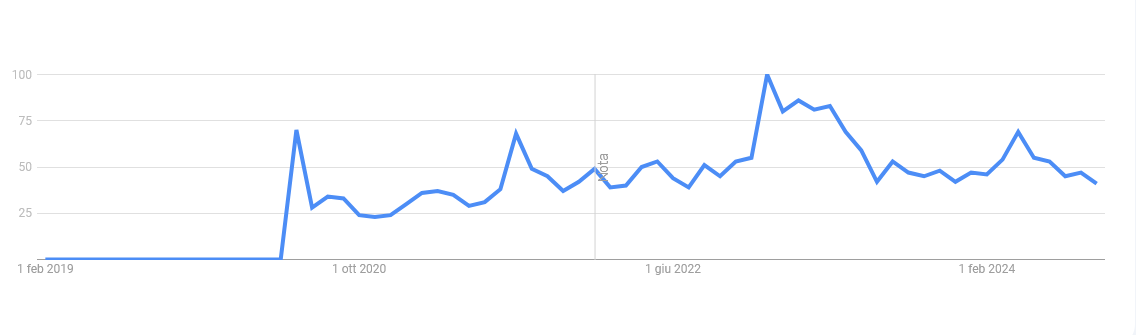 Nell'immagine ci sono le ricerche su Google del termine "ADHD" in Italia dal 2019 al 2024. Quella che si forma senza scrutinio e rimane statica, in base ai meccanismi interni agli algoritmi delle piattaforme online, è la versione dell’ADHD che viene resa popolare in un dato periodo e che resta immodificata nel tempo nonostante vengano aggiunte versioni correttive.
