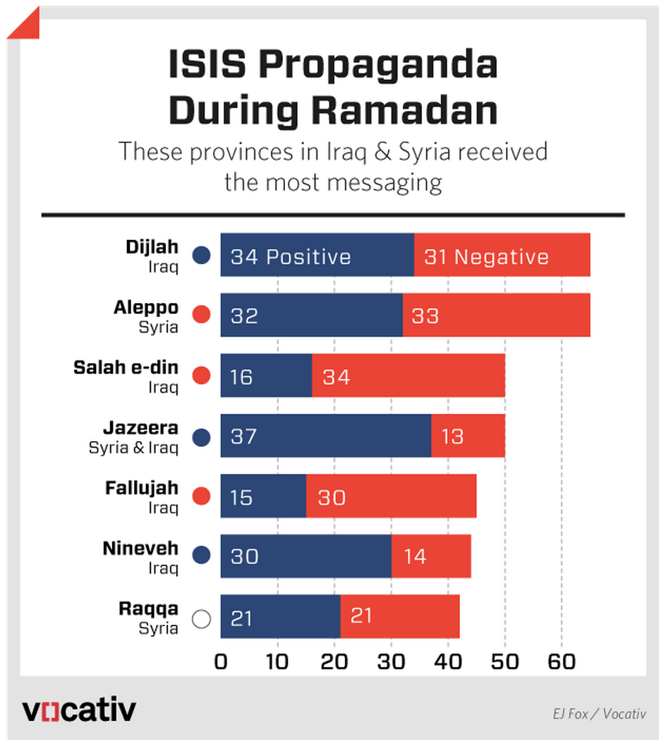 Per questo ai contenuti negativi, sanguinolenti, si accompagnano quelli positivi, su quanto sia lieta e serena e retta la vita nel Califfato. Un misto che di norma è in equilibrio, dice Vocativ sulla base di dati prodotti da proprie analisi, ma che durante il Ramadan – complice la chiamata alle armi e alla violenza, e il fatto che solo l'1% del materiale analizzato fosse destinato all'Occidente – ha visto prevalere gli elementi negativi, che sommano a un totale del 66% di tutte le comunicazioni ufficiali dell'organizzazione nel periodo considerato: