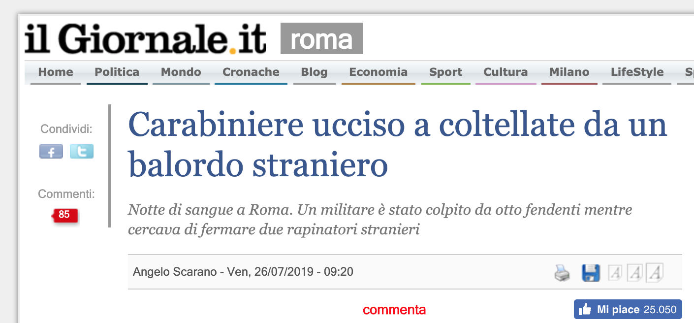 Insomma, una "morte annunciata", un "ennesimo agente ucciso da un clandestino" (l'equazione implicita è chiara, nordafricano = clandestino = criminale). Poco importa che la versione del giornale (così come del Tg2) contempli, in quel momento, una vittima "donna", che sarebbe stata derubata dai "due nordafricani" - e che in realtà è non solo un uomo, ma uno spacciatore, come si apprenderà in seguito: "servono rastrellamenti con l'esercito", scrive un lettore, non moderato dalla redazione.
