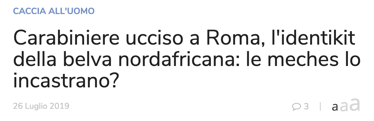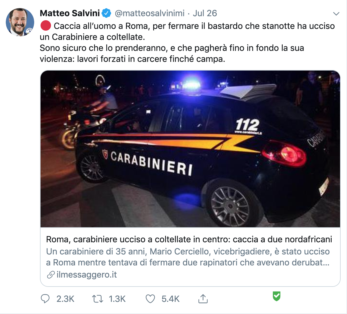 Il Post segnala che sul sito di Libero è ancora online questo articolo che indica nella "belva nordafricana” l'assassino del carabiniere. Lo spregio di ogni minima deontologia e, sopra ogni cosa, il giornalismo trasformato in propaganda. pic.twitter.com/pE1QOh5Boi