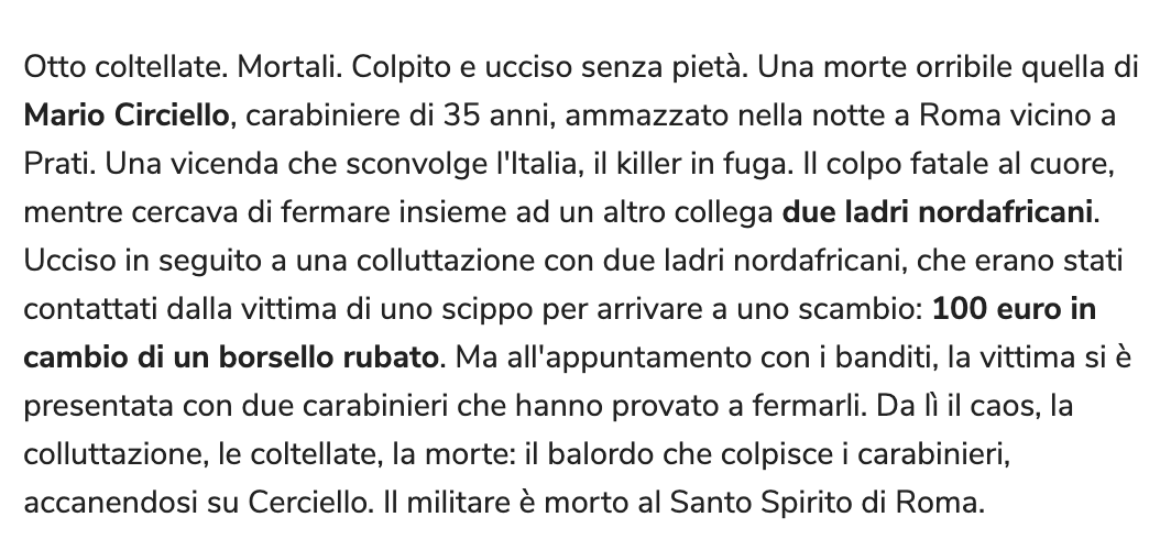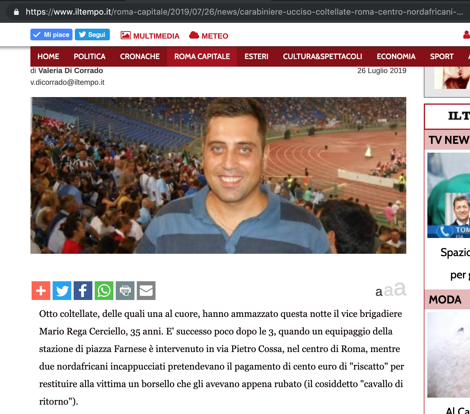 12 min letturaSono le 8.59 di venerdì quando l'ANSA batte una notizia terribile: un carabiniere, il vicebrigadiere Mario Rega Cerciello, sarebbe stato ucciso a Roma, accoltellato in via Pietro Cossa, nel quartiere Prati. "Dalle prime informazioni", si legge, "sembra sia stato colpito da un uomo, probabilmente nordafricano, bloccato insieme a un altro perché ritenuti responsabili di furto ed estorsione".