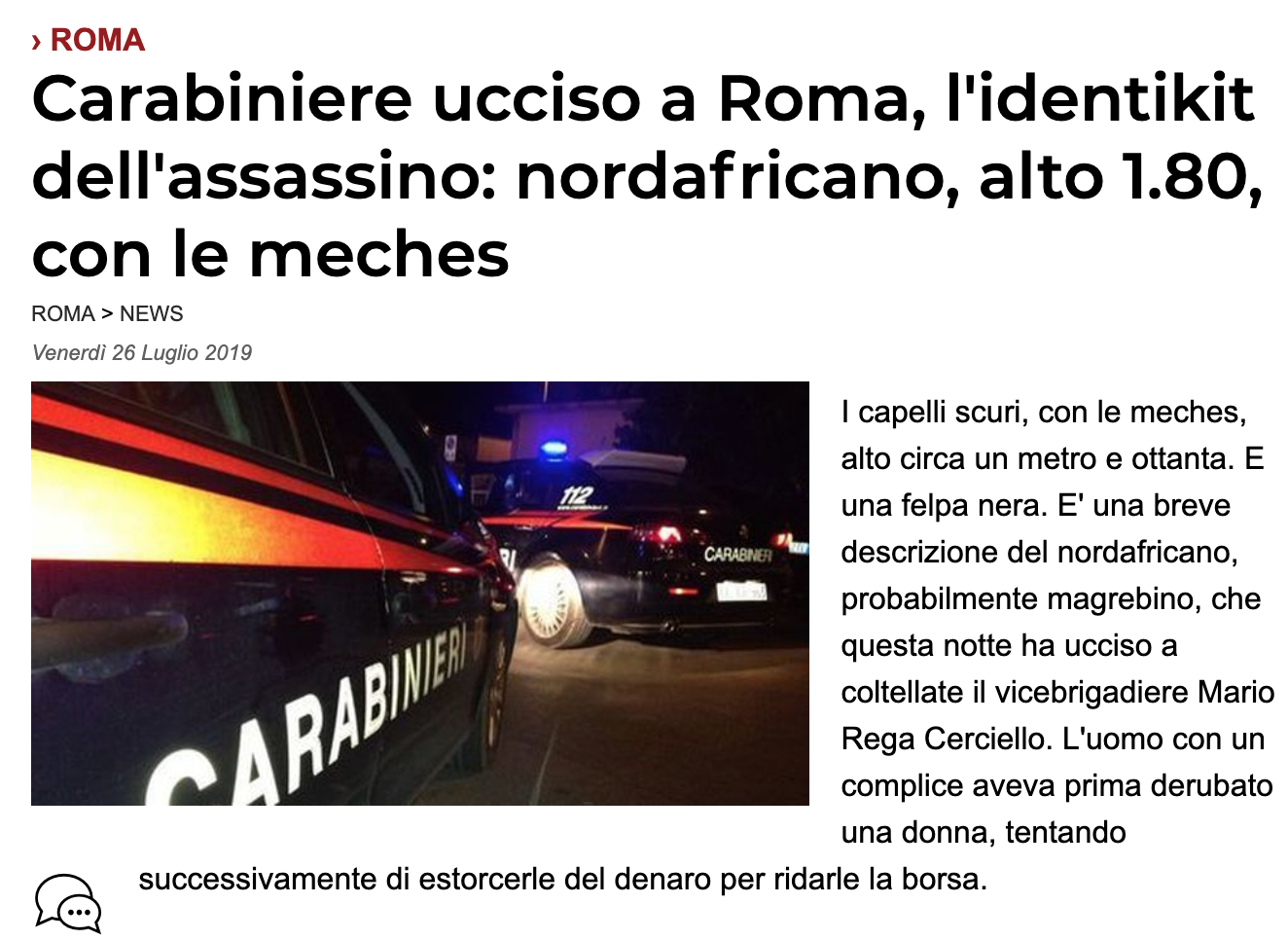 Nel frattempo un'altra agenzia spiega che l'iniziale descrizione fatta dal collega del carabiniere ucciso, che vedrebbe protagonisti "due magrebini di 20-25 anni" ha già fatto "il giro delle pattuglie del 112 delle volanti del 113 e nelle chat interne dei carabinieri". I canali "interni" sembrano del resto – scrive Wired – avere avuto un ruolo sostanziale nella diffusione della notizia, falsa ma circolata in rete, che i responsabili dell'omicidio sarebbero stati "3 cittadini di origini marocchine e uno di origine algerina". Le loro foto segnaletiche, pur se a occhi coperti, avevano circolato, si legge nell'articolo di Simone Fontana, su una pagina Facebook "agganciata al sito della Polizia e dunque utilizzata dalle forze dell'ordine", e "amministrata da due carabinieri attualmente in servizio". Da lì, poi, altre pagine di giustizieri da tastiera avevano contribuito a migliaia di condivisioni.