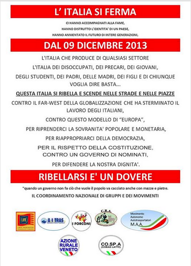 Forconi: Lo scorso 4 novembre Mariano Ferro, leader dei Forconi, annuncia dal suo sito che nella notte dell'8 dicembre l'Italia si sarebbe bloccata «da Pordenone alla Sicilia». Dopo i blocchi di un anno fa in Sicilia il movimento di Ferro, ex Mpa, prova a «far partire la ribellione» in tutto il territorio nazionale, perché «non c'è alternativa», sostengono, contro un governo che continua a tassare e a non cancellare i privilegi come un netto taglio alle pensioni d'oro. I forconi puntano sulla gente comune «che lavora e produce e che non ce la fa più» per una rivolta «pacifica e apartitica». Il 23 novembre Ferro pubblica il volantino della manifestazione che in chiusura ha come motto «quando il governo non fa ciò che vuole il popolo va cacciato anche con mazze e pietre».
