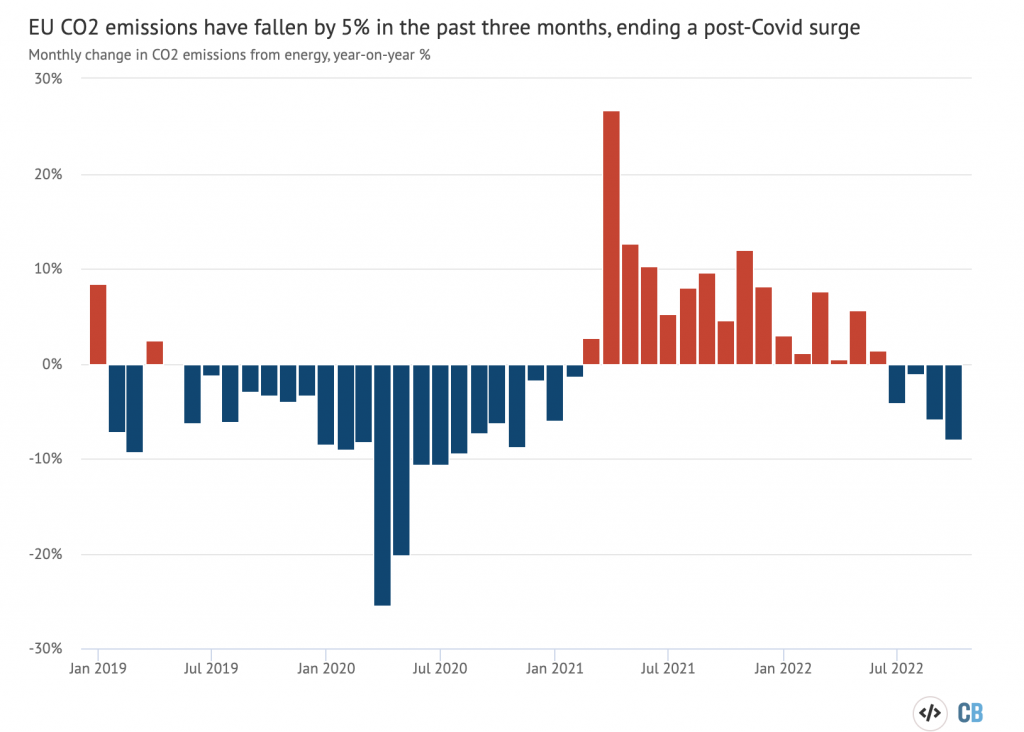 Secondo uno studio del Centre for Research on Energy and Clean Air (CREA), ripreso da Carbon Brief, negli ultimi tre mesi le emissioni di anidride carbonica dell'Unione Europea derivanti dall'uso di energia sono diminuite del 5% rispetto allo stesso periodo del 2021. Ad agosto le emissioni sono calate per la prima volta dopo un aumento costante ogni mese da marzo 2021 a luglio 2022 in seguito alle riaperture post-lockdown per la pandemia. Un segnale che contraddice le previsioni di un aumento delle emissioni dopo che molti paesi hanno guardato al carbone e a nuovi fornitori di gas per affrontare la crisi energetica. Anzi, nel mese di ottobre, è stato registrato un calo dell’8%.