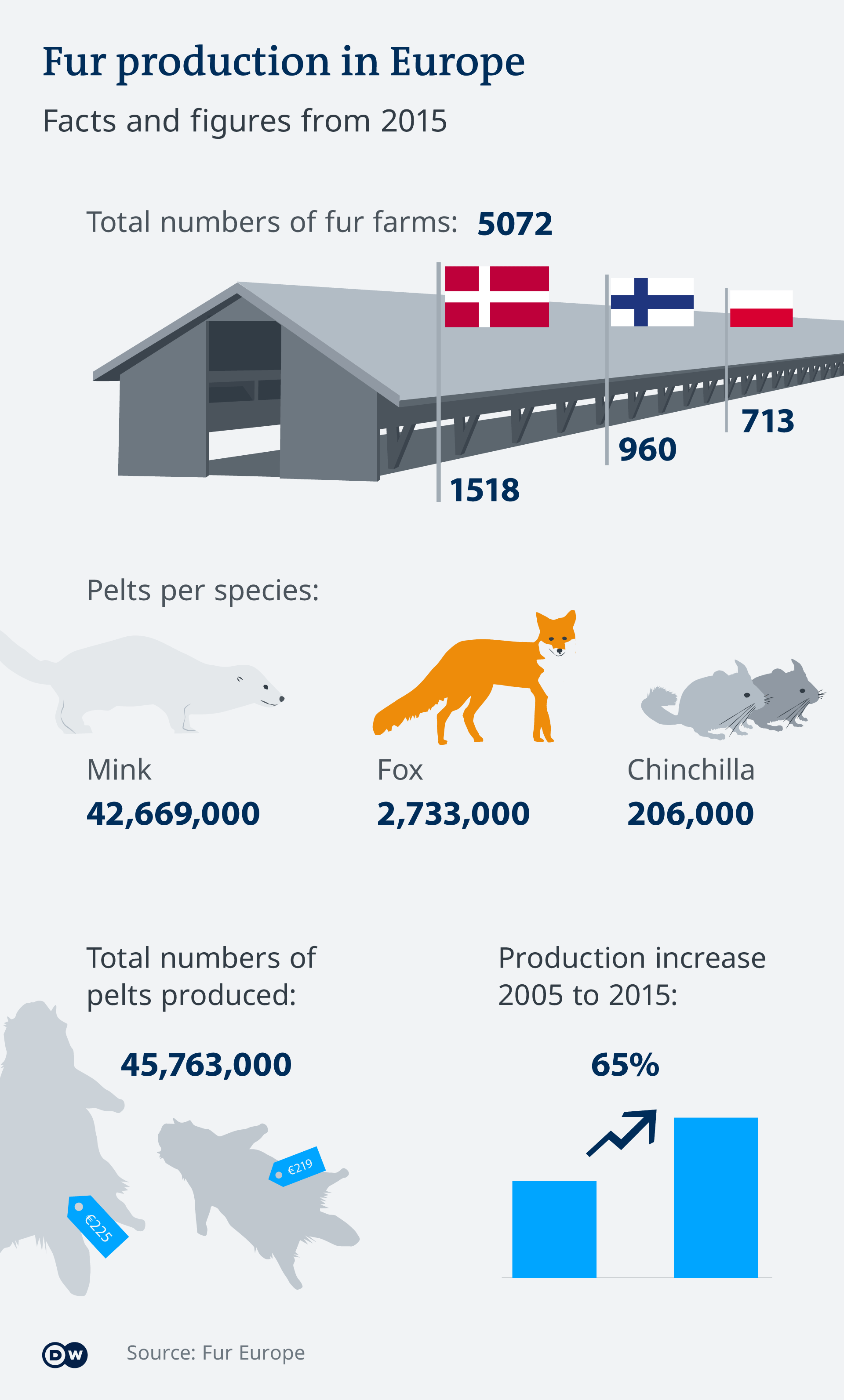 Per lungo tempo la Danimarca è stata uno dei maggiori esportatori mondiali di pellicce di visone. Il governo ha ordinato l'abbattimento di tutti i visoni nel paese. Kopenhagen Fur, la più grande casa d'aste danese di pellicce, ha dovuto chiudere l'attività .