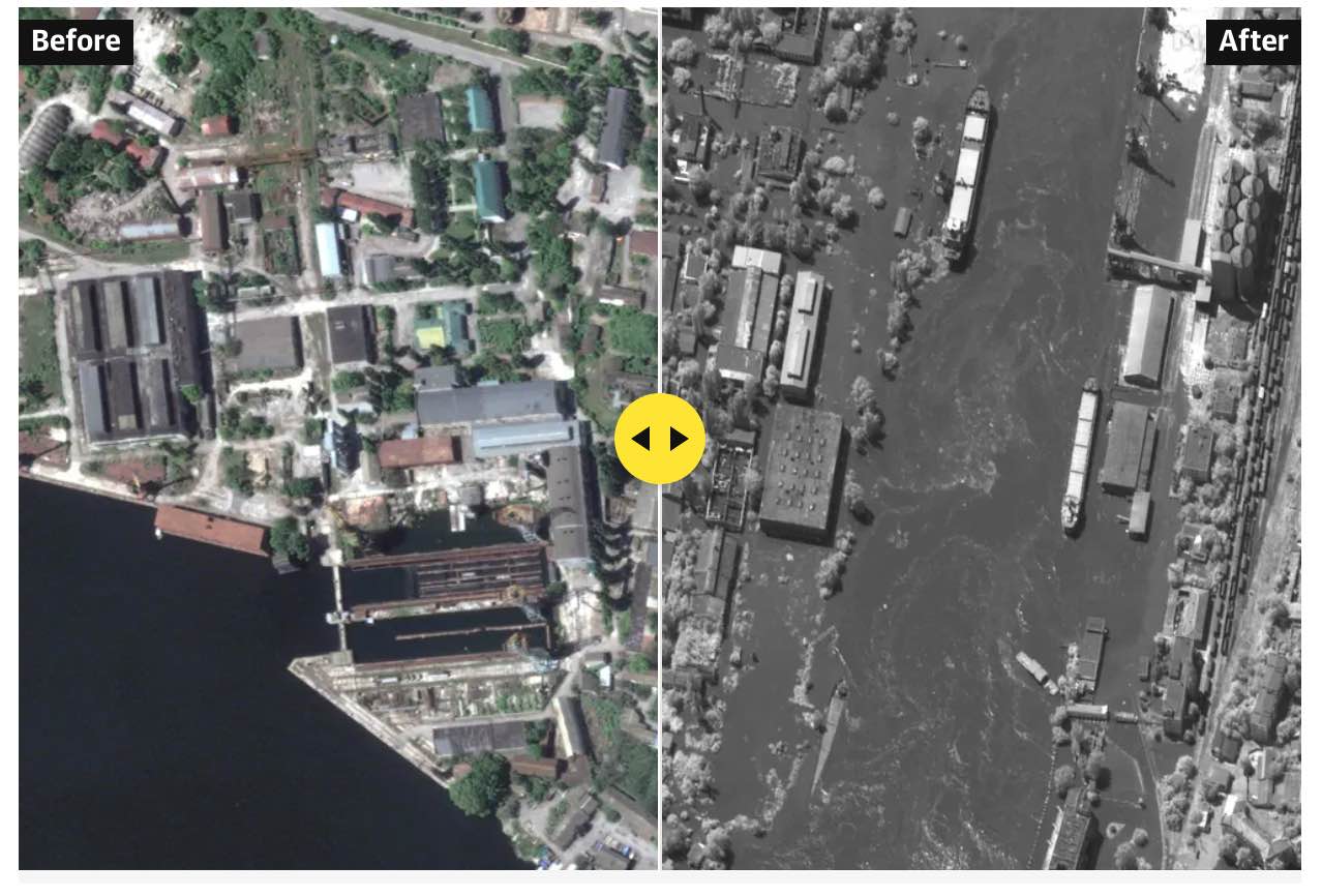 Le immagini satellitari precedenti e successive alla distruzione della diga restituiscono un quadro ancora più chiaro dell'entità dei danni.