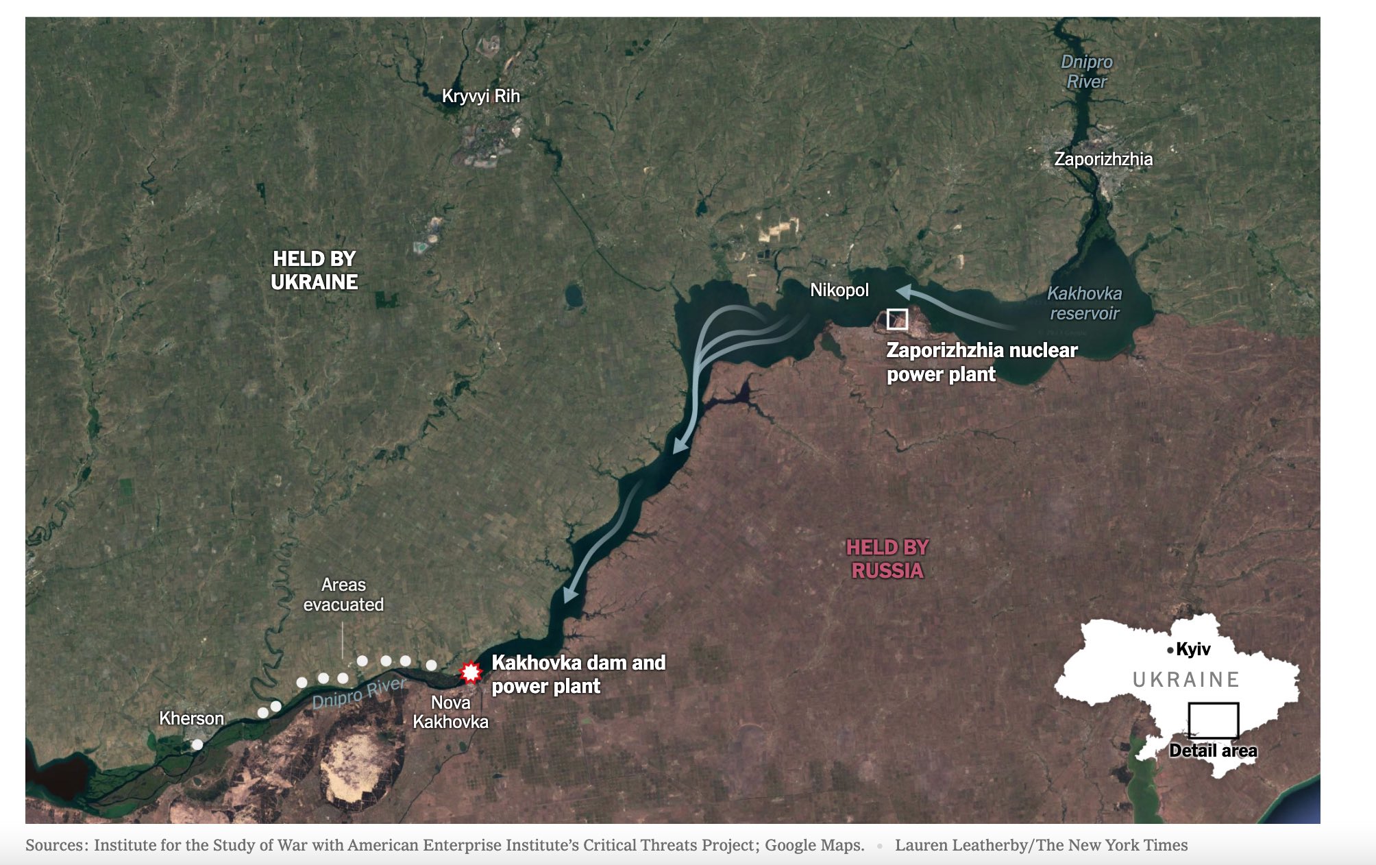 A torrent of water burst through a gaping hole in a dam on the Dnipro River that separates Russian and Ukrainian forces in southern Ukraine, flooding a swathe of the war zone and forcing villagers to flee https://t.co/0oMMp8IlSH pic.twitter.com/Suj8eKYl3k