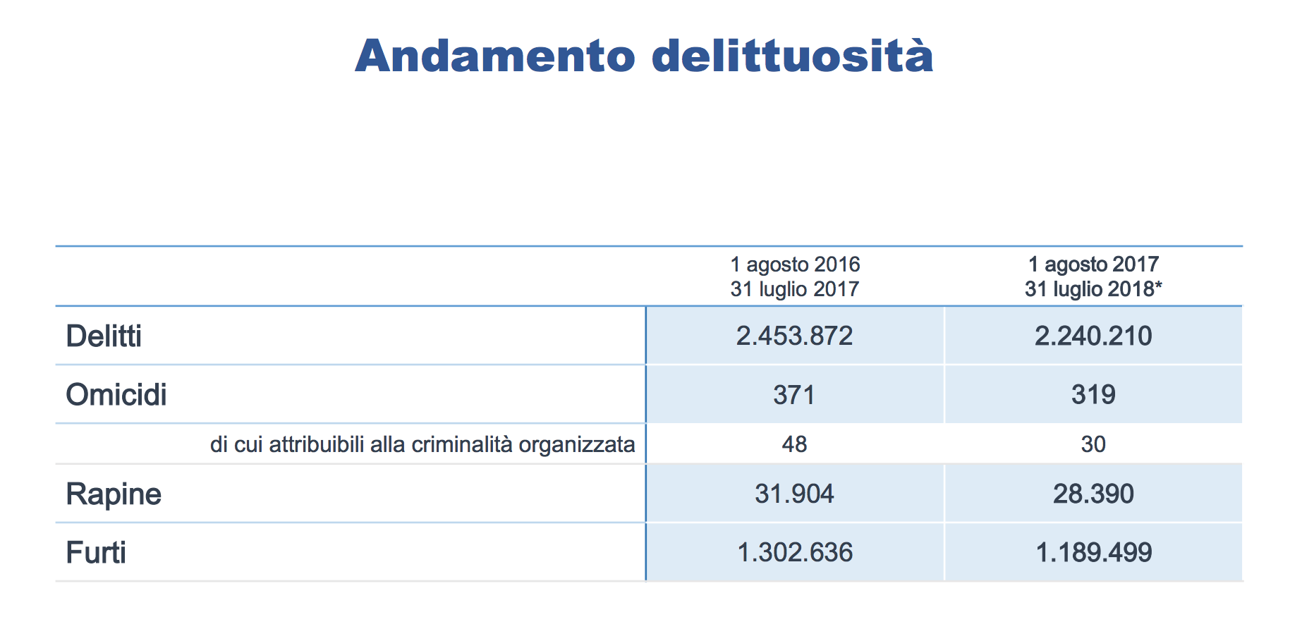 A distanza di un anno, in Italia si è registrata una riduzione del numero dei delitti, degli omicidi, dei furti e delle rapine.