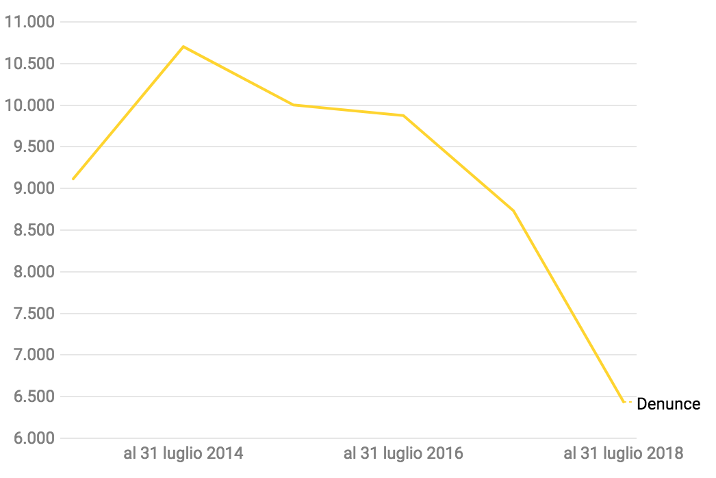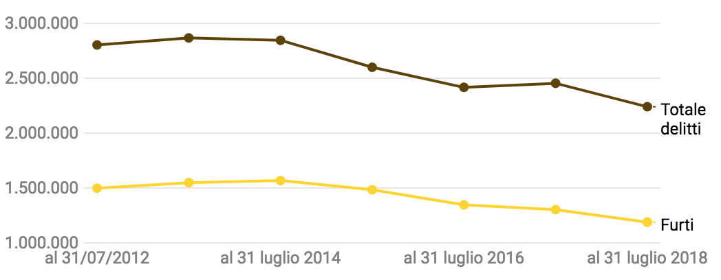 Allargando l’analisi agli ultimi 7 anni, come hanno fatto Marco Boscolo ed Elisabetta Tola su Agi, i dati mostrano il consolidamento di un trend che vede il numero dei delitti in costante calo. Si è passati da oltre 2,8 milioni a 2,2, con una diminuzione del 25,1%. Anche i furti sono scesi con una percentuale molto simile (25,9%), passando da circa 1,5 milioni nel 2011-2012 a quasi 1,2 milioni nell’ultimo anno.