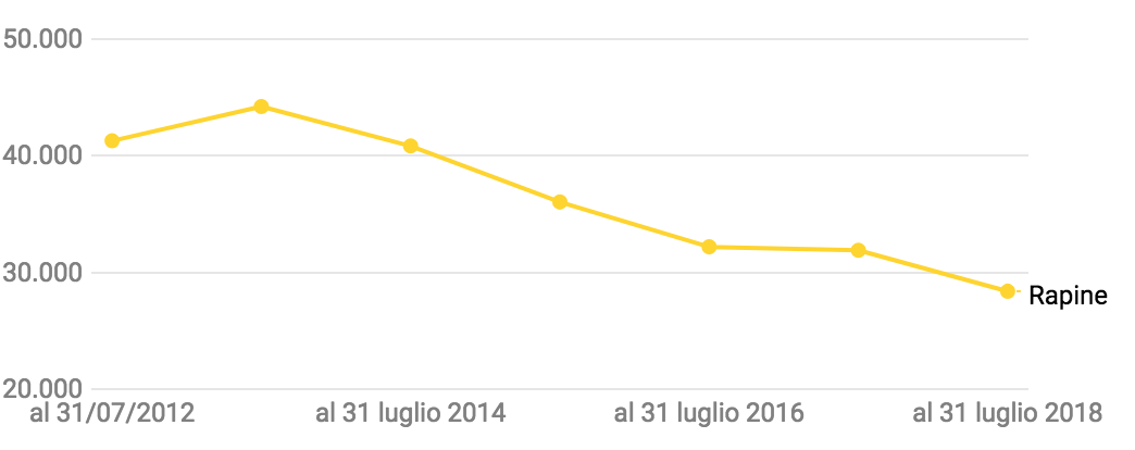 Il calo è ancora più sostanzioso se ci si riferisce alle rapine, che hanno segnato negli ultimi 5 anni un decremento del 45,4%.