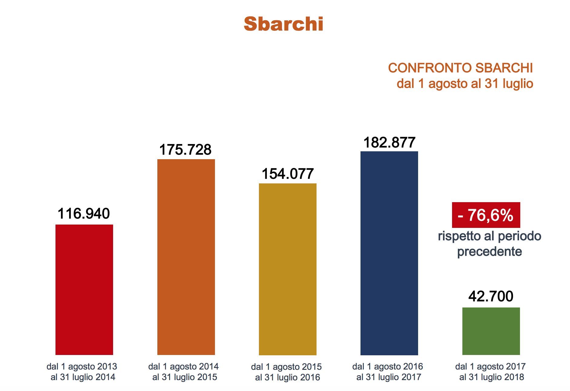 Tutti i dati sono in calo. Drasticamente ridotti gli sbarchi, 42700 al 31 luglio 2018, il 76,6% in meno rispetto allo stesso periodo dello scorso anno quando gli arrivi sulle coste italiane erano stati quasi 183mila. Diminuito anche il numero degli scafisti arrestati (209 quest’anno, 536 nel 2017) mentre in proporzione resta costante il numero dei minori arrivati (il 14,14% dei migranti arrivati nel 2018, il 13,55% nel 2017).