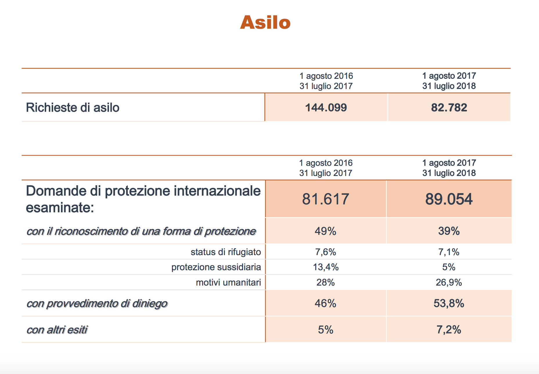 Sono calate le richieste di asilo (82782 contro le oltre 144mila nel 2017), mentre sono in aumento le richieste di protezione internazionale respinte (il 53,8%). In aumento anche i rimpatri, in particolare quelli volontari assistiti aumentati più del doppio: 1201 nel 2018, 596 lo scorso anno.