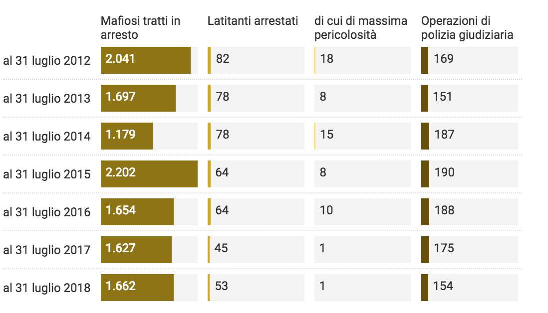 I dati presenti sono però disomogenei e non permettono comparazioni con gli anni precedenti, in particolare per quanto riguarda i beni sequestrati e le confische effettuate. Tra l’1 agosto 2017 e il 31 luglio 2018 sono state arrestate 1662 persone collegate alle mafie, tra questi 53 latitanti di rilievo. Fuori resterebbe un solo latitante definito di “massima pericolosità”, Matteo Messina Denaro. Per quanto riguarda sequestri e confische, i dati si riferiscono al periodo che va dall’1 gennaio 2017 al 31 luglio 2018, un arco temporale di 19 mesi, come sottolineano Marco Boscolo ed Elisabetta Tola. In questo lungo periodo sono stati sequestrati 22650 beni e ci sono state 9620 confische per un valore totale di 7,8 miliardi di euro.