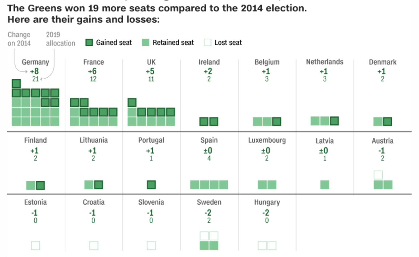 I Verdi hanno registrato il loro risultato migliore di sempre ottenendo 69 seggi, 18 in più rispetto al 2014, eleggendo almeno un eurodeputato in 15 paesi. I risultati più eclatanti in Germania dove con il 20,5% (quasi il doppio rispetto a 5 anni fa) sono stati il secondo partito dopo i conservatori della CDU guidati da Angela Merkel. I Verdi sono arrivati secondi anche in Finlandia (con il 16% dei voti), terzi in Francia (superando il 13%), Lussemburgo e Irlanda (dove per la prima volta in 20 anni elegge eurodeputati), ben piazzati anche in Belgio, Paesi Bassi e Regno Unito, dove con l’11% dei voti (nel 2014 avevano raggiunto il 7,67%) hanno superato i Conservatori.