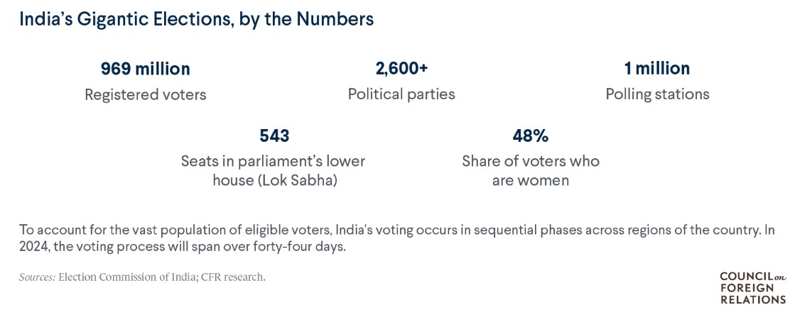 969 milioni di aventi diritto al voto; 2.600 partiti che hanno presentato candidati in almeno alcuni collegi; 1 milione di sezioni di voto; 543 seggi nel Lok Sabha (la camera bassa del parlamento dell’Unione); 48% la percentuale di donne tra i votanti.