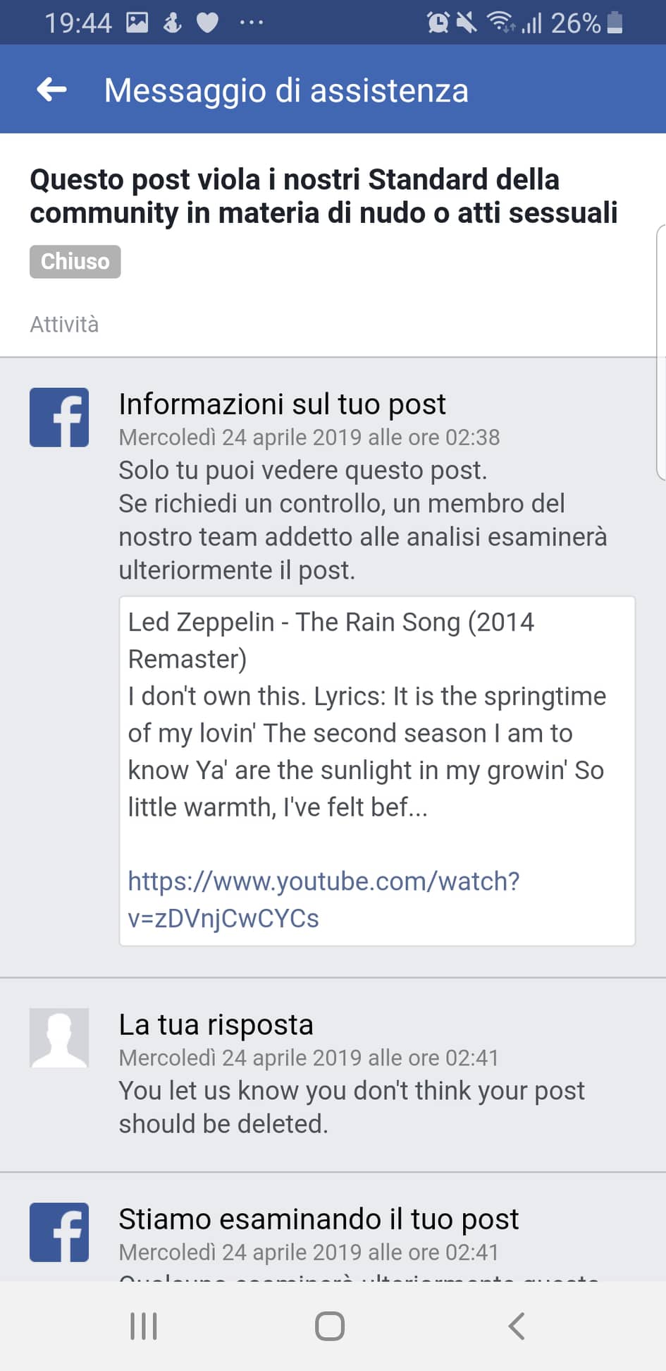Qualche giorno fa nel tentativo di pubblicare "The Rain Song", ha ricevuto immediatamente questo messaggio da Facebook. "Questo post viola i nostri Standard in termini di nudo o atti sessuali".
