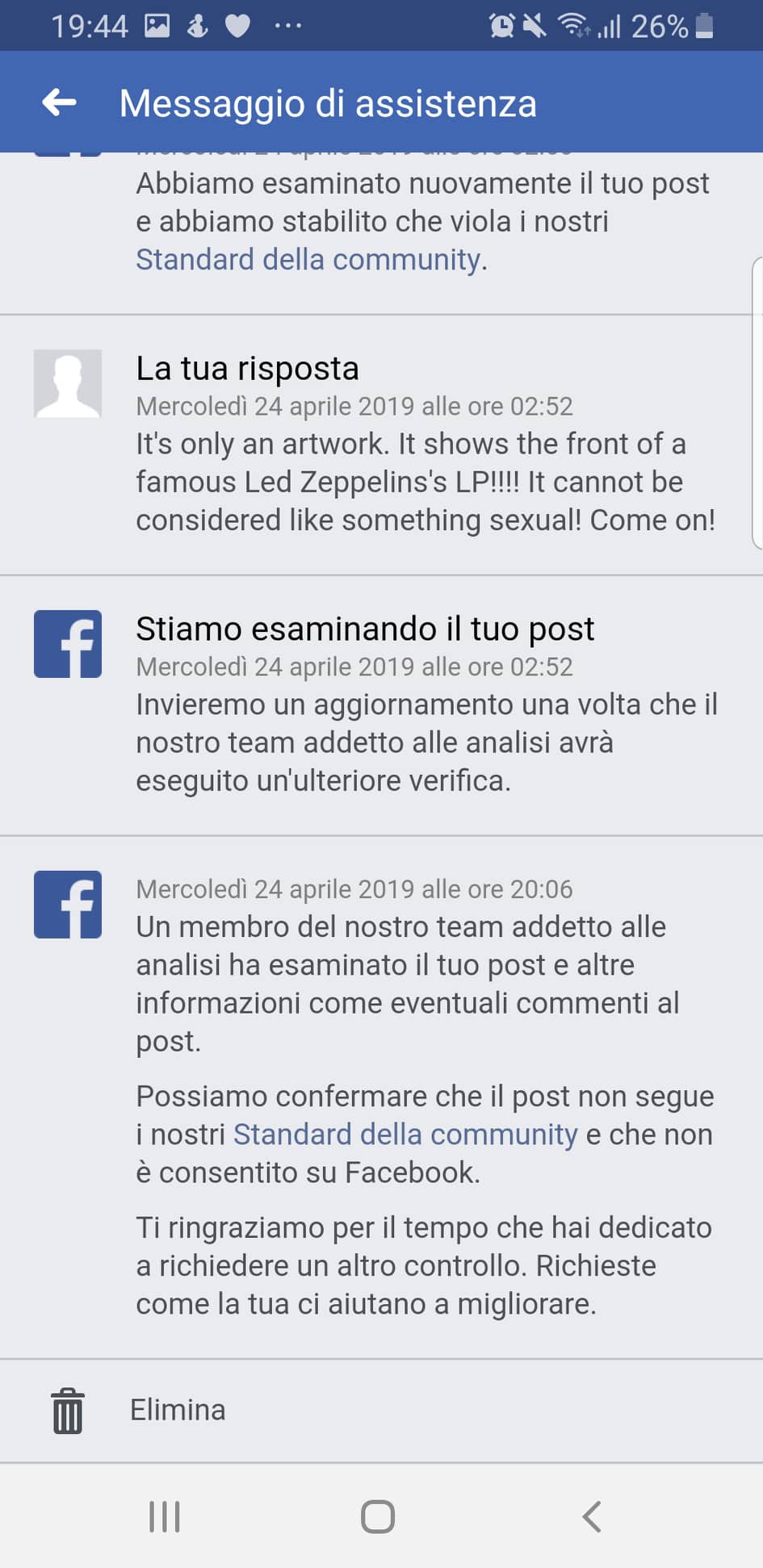3) La moderazione di Facebook NON tollera la copertina di uno dei più famosi album della storia della musica rock. Un artwork considerato da moderatori evidentemente poco preparati un nudo o pornografia.