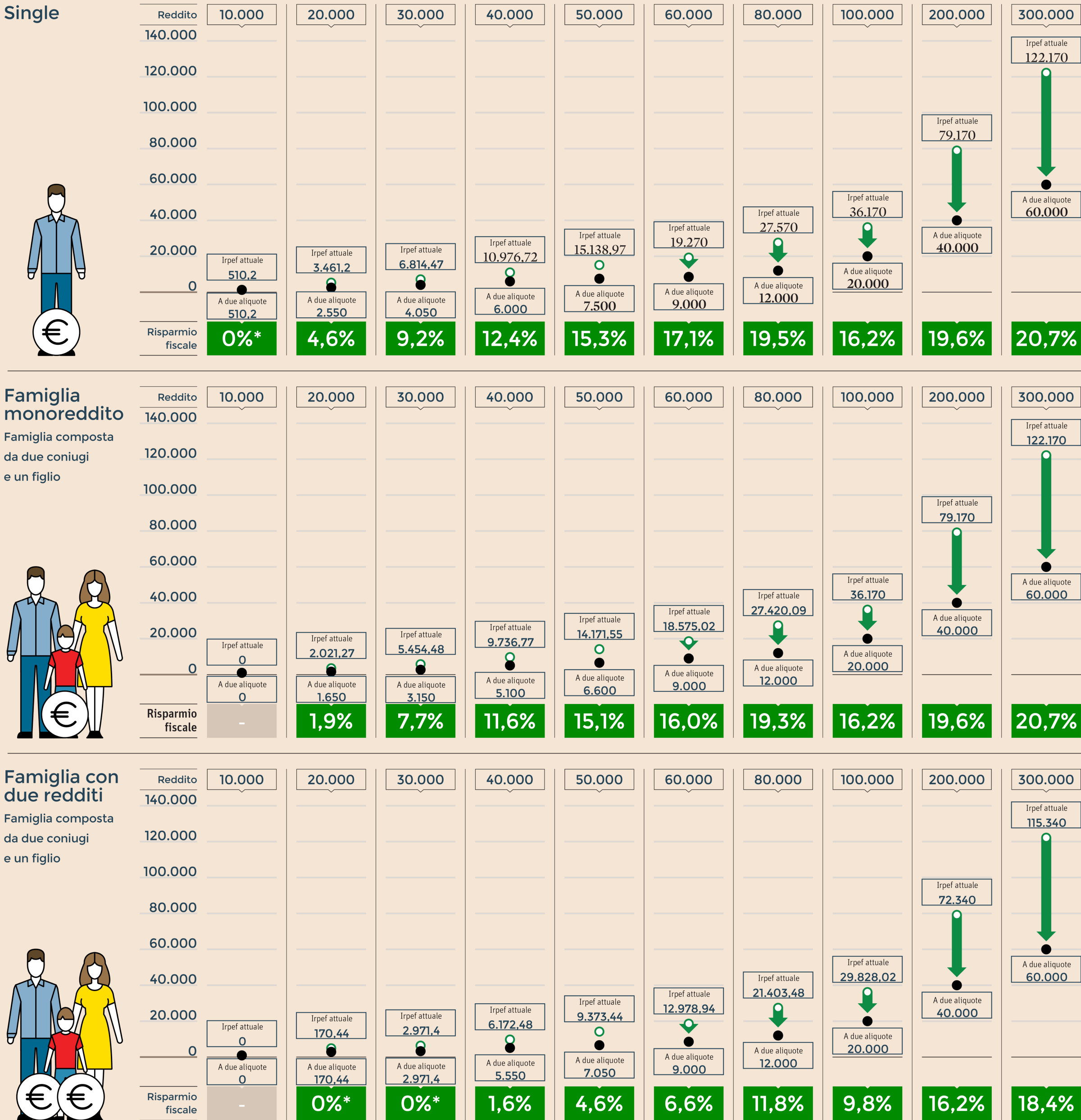 Il Sole spiega inoltre che “per capire a fondo gli effetti della possibile riforma bisogna partire dal perno del sistema, il concetto di «reddito familiare» che si sostituisce al valore individuale intorno a cui ruota l’Irpef di oggi. I 60–80mila euro di reddito complessivo in cui si concentrano in proporzione i risparmi più consistenti indicano senza dubbio una fascia medio-alta, ma va considerato che un’entrata familiare da 60mila euro può essere prodotta da due stipendi da 30mila euro, quindi in pieno ceto medio”.