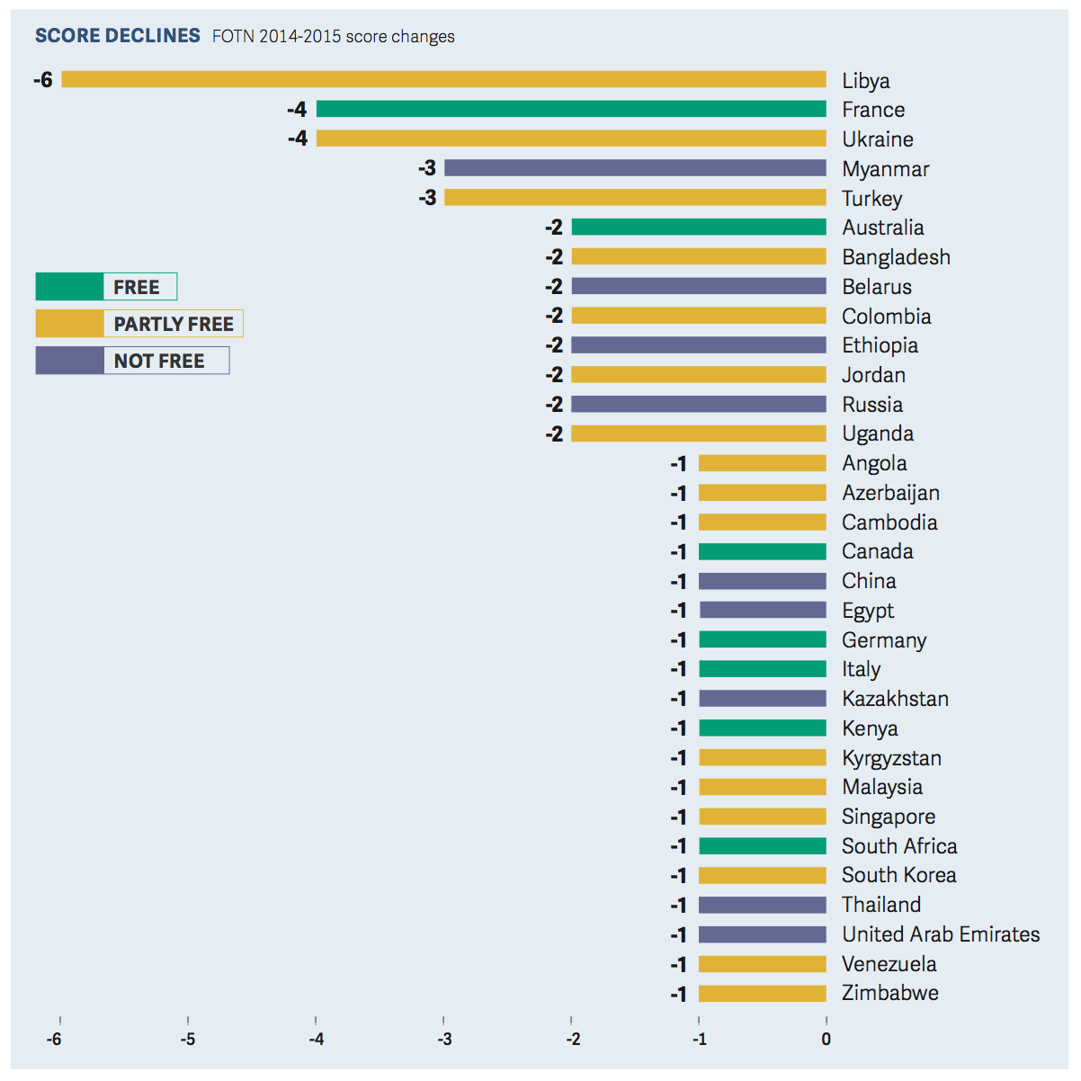 Tradotto, significa che nell'anno considerato - da giugno 2014 a maggio 2015 - in 32 dei paesi studiati la traiettoria delle libertà online è negativa, con Francia (appunto), Libia e Ucraina in testa; e che solo in 15, invece, le libertà aumentano.