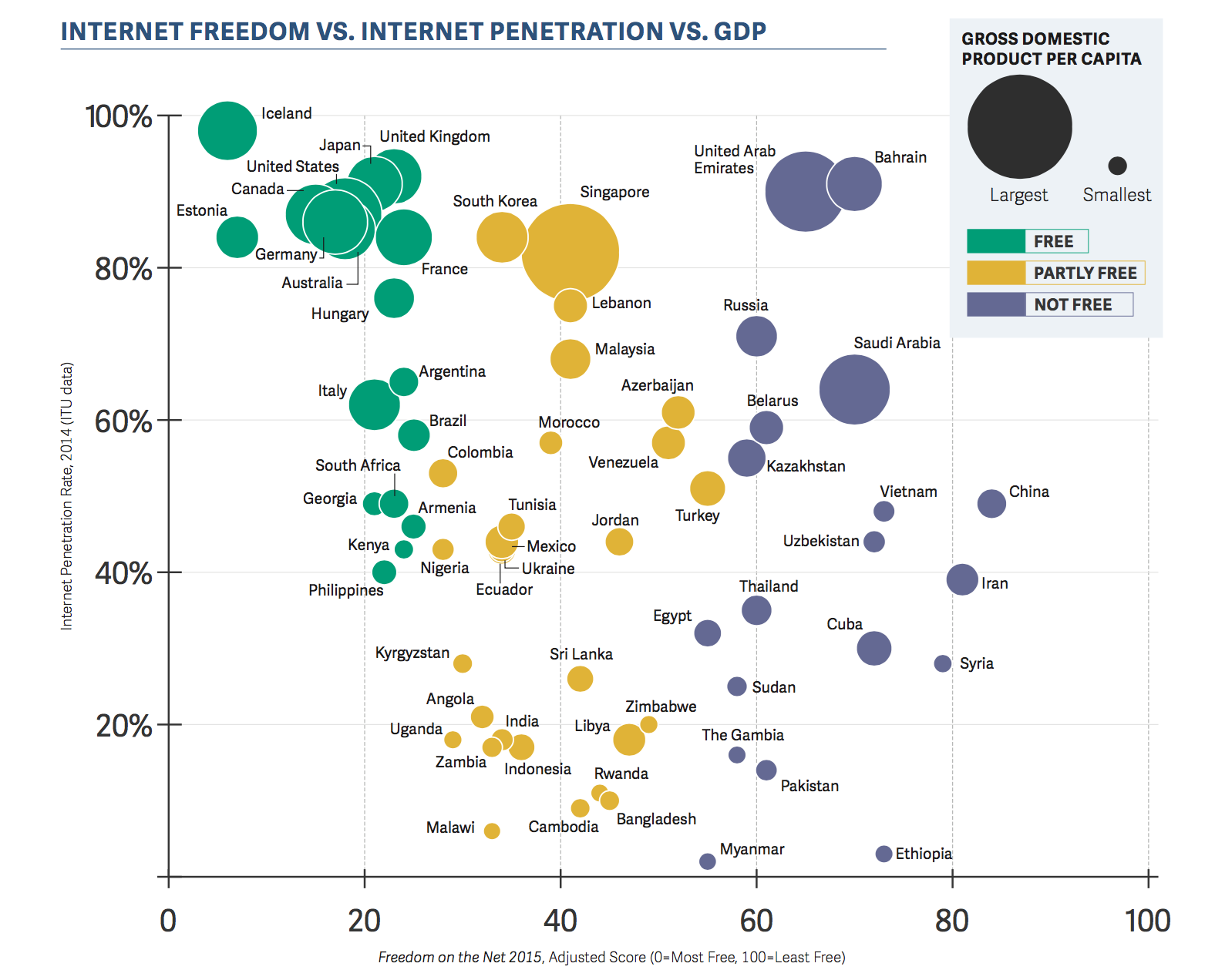 Mentre la ricchezza si traduce in genere in maggiore accesso, nessuna di queste due grandezze è un indicatore decisivo per quanto riguarda la libertà di espressione, la privacy o l’accesso all’informazione online.