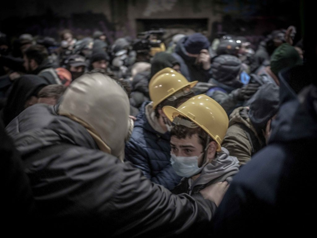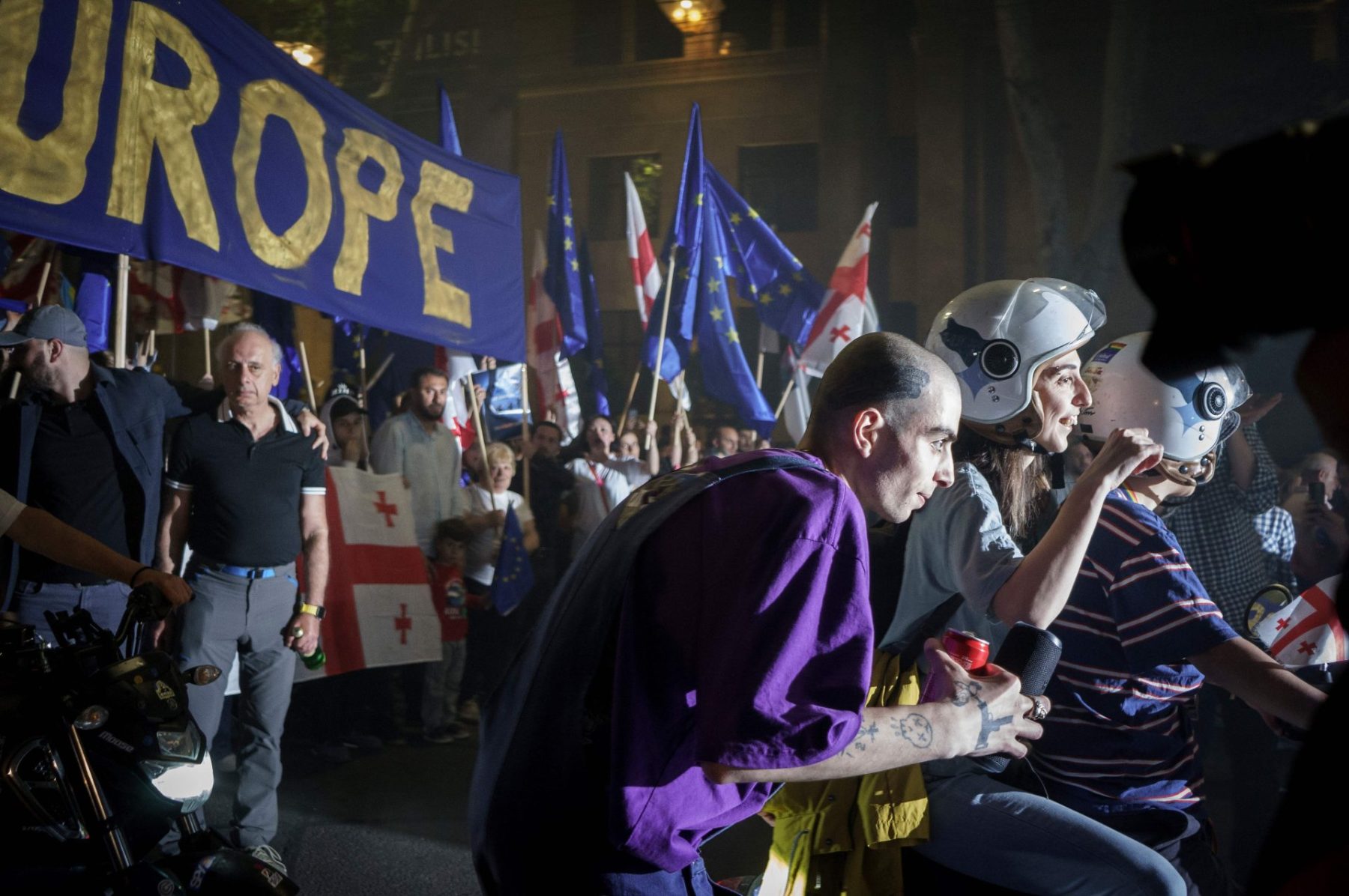 La foto è di qualche giorno fa, quando io e mio padre abbiamo preso molti lacrimogeni. Le persone si tenevano strette l'una all'altra: dicevano “va tutto bene”, invitavano a stare insieme e camminare con prudenza. Poi la gente ha iniziato a farsi prendere dal panico, ma è andato tutto bene. Alcuni sono venuti ad aiutarci. Si possono vedere le lacrime negli occhi di quest'uomo, che è spaventato dai gas lacrimogeni, ma l'altro uomo con la maschera antigas sovietica lo tranquillizza e lo aiuta, emotivamente e fisicamente.Quel giorno stavo fotografando soprattutto ambulanze.Ho sentito qualcuno dire che questo ragazzo era caduto dal Parlamento.Durante la protesta, la gente lasciava sempre un varco nella folla per far passare le persone.Qui si vede un manifestante che aiuta a trasportare la barella.Ho visto molte coppie come questa, ma anche sconosciuti che si tenevano per mano per attraversare la folla.Si vede dal suo volto che è preoccupata, forse per il gas, o per il suo futuro e per quello del paese.Qui, i manifestanti sono andati alla sede di Pirveli (emittente televisiva filogovernativa) e hanno chiesto di poter tenere un dibattito in diretta TV, perché molte persone nei piccoli villaggi guardano questo canale televisivo di propaganda e non sanno cosa stia realmente accadendo.Non sanno che poliziotti a volto coperto picchiano le persone, perché non viene mostrato. I manifestanti sono entrati a forza chiedendo una “diretta” - e l'hanno ottenuta.La gente ha iniziato a inseguire un operatore e un giornalista di Imedi TV (emittente sostenuta dallo Stato) e li ha inseguiti per tutta la protesta, gridando e lanciando loro addosso uova e acqua.Non li hanno attaccati, ma sono stati aggressivi e non hanno permesso loro di filmare.Un politico dell'opposizione, Elene Khoshtaria, è venuto a proteggerli, dicendo ai manifestanti di non toccare i media, perché erano lì per fare il loro lavoro.In seguito è stata colpita da un cannone ad acqua, è caduta a terra e si è rotta una mano.Mi piace questa foto perché si vede una poliziotta in mezzo a un mare di uomini.Prima che scattassi la foto, c'era una donna che discuteva con tutti i poliziotti e tutti avevano espressioni diverse sul viso.Uno guarda interessato, l'altro dice: “Di cosa sta parlando?”.Stanno tutti pensando.Ma cosa stanno pensando?Da che parte stanno?Forse vorrebbero unirsi ai manifestanti ma non possono...Questa l'ho scattata vicino al sobborgo di Saburtalo. Era presto, all'inizio della protesta, quando i cortei erano appena iniziati. L'atmosfera era diversa: aperta, spaziosa. C'erano alcune persone in bicicletta, una sensazione molto europea, non qualcosa che si vede spesso in Georgia. C'era musica da un camion in transito, e hanno dato alle persone il microfono per parlare. Finora è stata una delle proteste più organizzate cui ho preso parte.Questa è del marzo scorso. C'erano molti giovani, era pieno di colori. Questo ragazzo è in realtà su uno skateboard e sta suonando.Questa protesta è stata organizzata da un giovane movimento studentesco chiamato Dafioni. L'anno scorso hanno guidato diverse marce studentesche, in questa gli studenti hanno preso d'assalto la loro università. Il messaggio sulla lavagna è chiaro: “No alla legge russa”.Questa è una delle mie foto preferite. Sembra più un dipinto che una fotografia. È notte, durante una marcia studentesca, e c'è una ragazza bellissima. L'immagine cattura perfettamente lo stato d'animo: le persone sono chiaramente stanche, ma ancora determinate ad andare avanti.Non so se si stesse nascondendo dalla telecamera o se fosse uno scherzo. Molti giovani andavano alle proteste, alcuni uscivano di nascosto per essere lì. Qui era uno dei giorni in cui stavano accampati vicino al Parlamento, circa due settimane fa. Lei era in piedi in mezzo a questa folla di poliziotti, e tutti loro la guardavano. Il più delle volte i loro volti sembravano indifferenti, come se fossero stati di vetro.Questo è stato uno dei giorni di proteste non-stop. La polizia picchiava le persone e cercava di arrestarle. Di solito picchiavano la gente di notte, ma qui siamo in pieno giorno, verso mezzogiorno. Le persone che erano lì da due giorni ininterrottamente se ne andavano e altre arrivavano. Come se ci fossero dei turni. La coppia nella foto ha iniziato a sonnecchiare. Dopo ha condiviso snack e caffè con i poliziotti accanto.