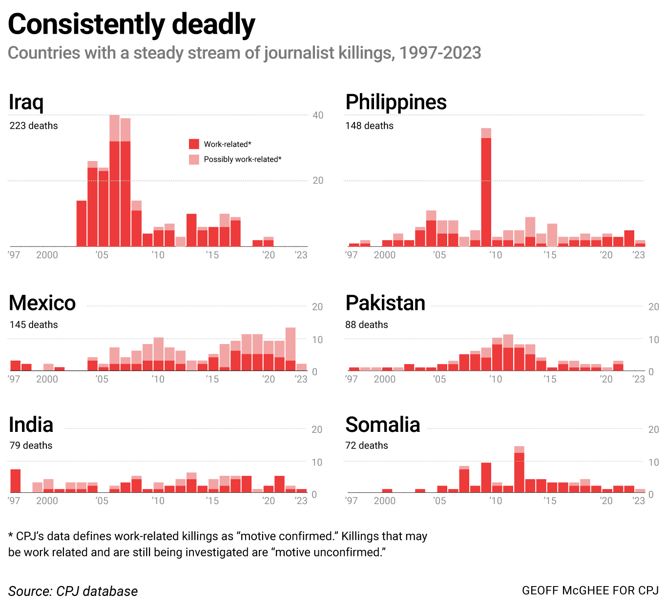 Nelle Filippine, 94 dei 96 giornalisti uccisi dal 1992 al 2023 sono stati assassinati in relazione al loro lavoro. I più vulnerabili sono i giornalisti radiofonici. Il tasso di mortalità è rimasto costante nell'Africa subsahariana, con sei giornalisti uccisi all'anno dal 2021. E se in Somalia, il numero di giornalisti uccisi è inferiore ai picchi registrati tra il 2009 e il 2013, l'impunità rimane alta e gli sforzi del governo per assicurare alla giustizia gli assassini dei giornalisti non sembrano andare oltre gli annunci. In Camerun, l'omicidio di due giornalisti, Martinez Zogo e Jean-Jacques Ola Bebe, è avvenuto nel bel mezzo di una lotta di successione per il potere tra fazioni governative.