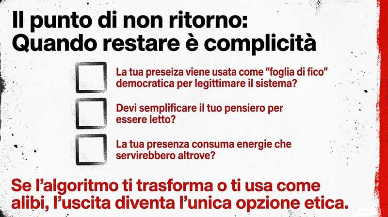 Ovviamente, non esiste una risposta valida per tutti, e non esiste una risposta valida per sempre. L’etica qui è situata e temporale, reversibile. Può essere giusto uscire oggi ma tornare domani, rimanere in forma minima, oppure andarsene per sempre. L’unica cosa che è certamente sbagliata è rimanere per inerzia.