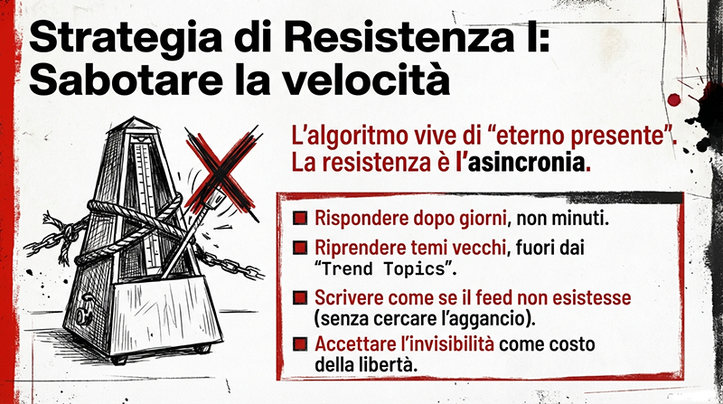 Chiariamo immediatamente: resistere senza uscire non significa battere l’algoritmo, piuttosto sottrarsi alla sua pedagogia pur restando nell’infrastruttura.