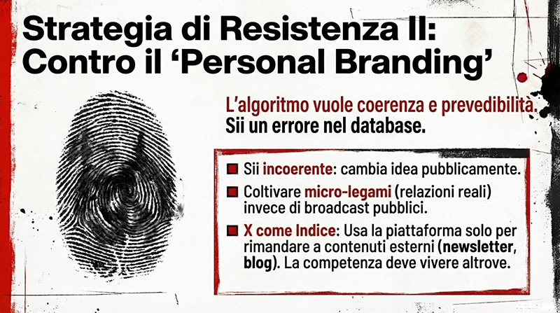 Punto centrale della resistenza è non accettare l’idea di identità come brand. Il soggetto di X è riconoscibile, prevedibile e quindi categorizzabile. Resistere vuol dire non costruire un’identità coerente, cambiare idea, non chiarire “da che parte stai”.