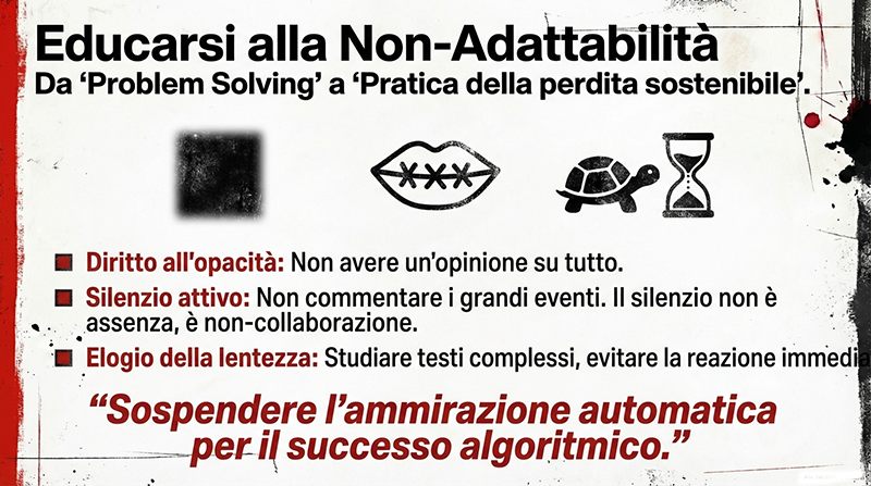 L’algoritmo richiede chiarezza, identità e posizionamento costante. La non-adattabilità è il diritto a non dire tutto, a non avere un’opinione pronta, a prendersi il tempo per pensare, a sospendere il giudizio pubblico. L’opacità non è menzogna, ma difesa cognitiva.