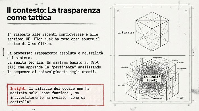 Fin qui una sintesi ragionata delle analisi pubblicate proprio su X della lettura del lungo e complesso codice di X. Ovviamente non siamo in grado di confutare queste affermazioni, ma la lettura delle stesse fa emergere che siano meno neutre di quanto vogliono far credere. Ci sono molte cose che non tornano, anche semplicemente comparando queste analisi all’esperienza quotidiana. Non torna la pretesa di neutralità, la moralizzazione del controllo, la confusione tra conversazione e tensione, la trasformazione dell’attenzione in valore etico. Proviamo a ricostruire il tutto sotto una diversa lente, premettendo fin da subito che si tratta di una lettura parziale e, sotto molti aspetti, soggettiva.