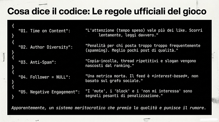 Quindi, appare evidente che le analisi tecniche del codice di X, pubblicate su X, sono più che altro interpretazioni normative travestite da analisi, in coerenza col funzionamento algoritmico della piattaforma. Le analisi descrivono come dovresti comportarti per essere accettabile su X. In breve sono norme sociali mascherate da consiglio tecnico. Quello che emerge è più che altro un algoritmo che educa la società, premiando alcune forme di espressione e rendendone altre invisibili.