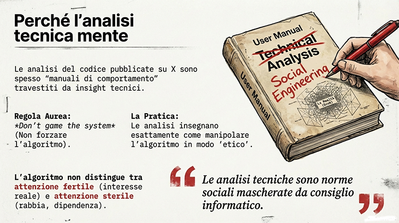 La regola “don’t game the system”, ad esempio, appare un'evidente contraddizione logica. Stiamo parlando di un algoritmo con una serie di regole operative, che promette “successo”. Le analisi pubblicate su X sono esse stesse, quindi, dei piccoli manuali per gamificare il sistema, solo tradotte in una forma etica. Tutte o quasi dicono: “non manipolare l’algoritmo, ma ti spiego come manipolarlo bene”.